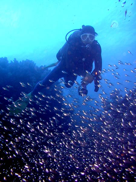 キンメモドキ 大瀬 2025.05.27 [ 大瀬 ][ 上級 ] 体長 3〜5cm程度(群れは大きい) 水深 1〜30m程度 生息環境 サンゴ礁や根周りの群れ 分類 スズキ目・テンジクダイ科 キンメモドキは、銀色の体が光に反射してキラキラ輝く可愛い魚です。群れで泳ぐ姿はとても癒されますね。 食べ物 プランクトンや微小な生物を食べます。 日頃の生活 群れで根周りを泳ぎながら餌を探しています。 まめ知恵袋 光を浴びて群れが輝く姿はとても美しいですよ。 撮影する時のコツ ワイド撮影で群れの迫力を活かすと素敵な写真になります。 [ 大瀬 ][ 上級 ]