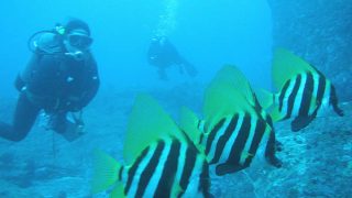 タテジマキンチャクダイは、黄色と青の縞模様が美しい魚です。成長すると模様が変わるのも面白いですね。