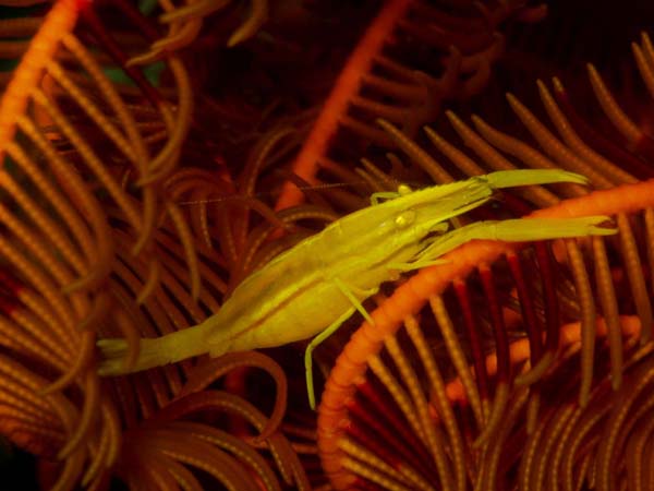 ウミシダヤドリエビ 双子瀬 2025.05.27 [ 双子瀬 ][ 中級 ] 体長 2〜3cm程度 水深 5〜30m程度 生息環境 ウミシダの中 分類 十脚目・ウミシダヤドリエビ科 ウミシダヤドリエビは、ウミシダに寄り添って暮らす小さなエビです。ウミシダと同じ色に擬態している姿はとても面白いですね。 食べ物 微小な有機物やプランクトンを食べます。 日頃の生活 ウミシダの中でじっとしています。 まめ知恵袋 擬態がとても上手で見つけると嬉しくなります。 撮影する時のコツ マクロ撮影で擬態ぶりをしっかり写すと面白い写真になります。 [ 双子瀬 ][ 中級 ]