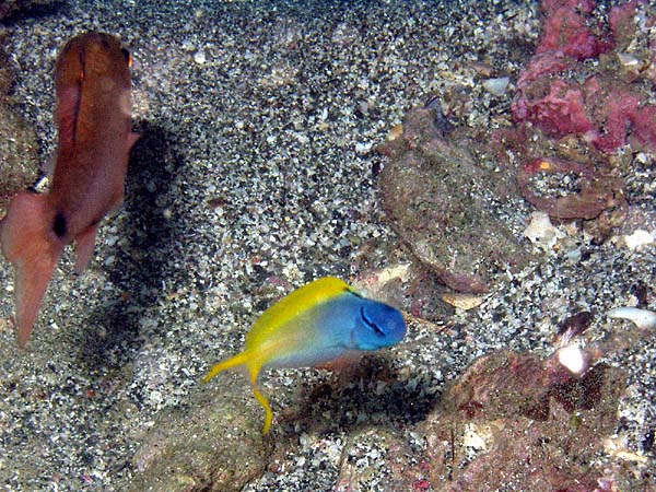 オオゴンニジギンポ ブクブクビーチ 2025.05.27 [ ブクブクビーチ ][ 初級 ] 体長 5〜10cm程度 水深 1〜20m程度 生息環境 サンゴ礁や岩礁の根周り 分類 スズキ目・ニジギンポ科 オオゴンニジギンポは、黄色い体と青い線がとても鮮やかで可愛い小魚です。岩陰から顔をひょっこり出す姿はとても癒されますね。 食べ物 小さな甲殻類や藻類を食べます。 日頃の生活 岩陰に隠れて顔を出していることが多いです。 まめ知恵袋 青いラインがとても綺麗で目立ちますよ。 撮影する時のコツ マクロ撮影で顔の表情や体色をしっかり写すと可愛い写真になります。 [ ブクブクビーチ ][ 初級 ]