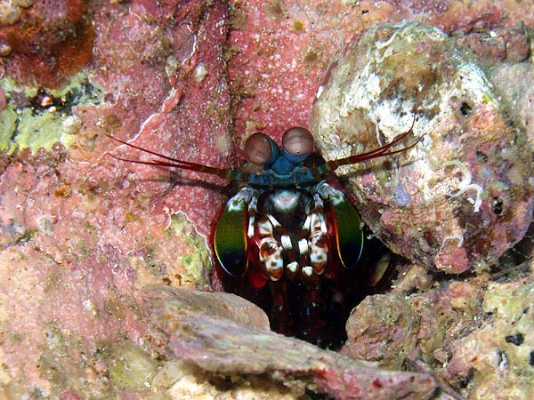 モンハナシャコ 末粕鼻 2025.05.27 [ 末粕鼻 ][ 初級 ] 体長 10〜15cm程度 水深 5〜30m程度 生息環境 サンゴ礁や岩礁の砂地 分類 口脚目・シャコ科 モンハナシャコは、カラフルな体色と大きな目が特徴の可愛いシャコです。巣穴から顔を出す姿はとても面白いですよ。 食べ物 小さな甲殻類や貝類を食べます。 日頃の生活 砂地に掘った穴の中で暮らしています。 まめ知恵袋 目の動きがとてもユニークで面白いです。 撮影する時のコツ マクロ撮影で目の表情をしっかり写すと可愛い写真になります。 [ 末粕鼻 ][ 初級 ]