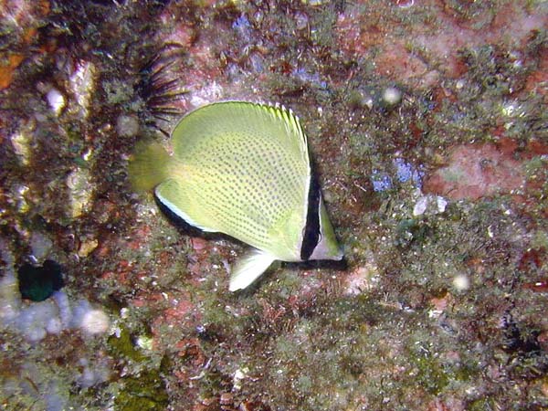 ゴマチョウチョウウオ 末粕鼻 2025.05.27 [ 末粕鼻 ][ 初級 ] 体長 10〜15cm程度 水深 5〜20m程度 生息環境 サンゴ礁や岩礁の根周り 分類 スズキ目・チョウチョウウオ科 ゴマチョウチョウウオは、黄色い体にゴマ模様が特徴の可愛い魚です。ペアで泳ぐ姿はとても癒されますよ。 食べ物 小さな無脊椎動物や藻類を食べます。 日頃の生活 根周りをちょこまか泳ぎながら餌を探しています。 まめ知恵袋 黄色い体色はとても目立って綺麗ですよ。 撮影する時のコツ ワイド撮影でペアの姿をしっかり写すと可愛い写真になります。 [ 末粕鼻 ][ 初級 ]
