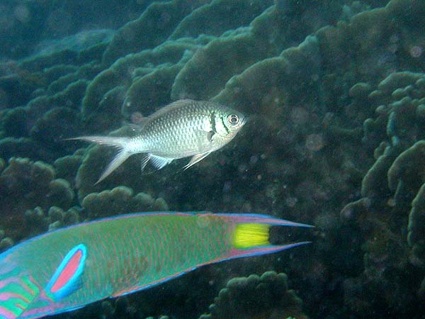 タカサゴスズメダイ 網代 2025.05.27 [ 網代 ][ 初級 ] 体長 8〜12cm程度 水深 5〜30m程度 生息環境 サンゴ礁や岩礁の根周り 分類 スズキ目・スズメダイ科 タカサゴスズメダイは、黄色い体と白い尾びれが可愛い小さな魚です。群れで泳ぐ姿はとても癒されますね。 食べ物 プランクトンや藻類を食べます。 日頃の生活 根周りを群れで泳ぎながら餌を探しています。 まめ知恵袋 黄色い体色はとても目立って綺麗ですよ。 撮影する時のコツ ワイド撮影で群れ全体を捉えるととても可愛い写真になります。 [ 網代 ][ 初級 ]