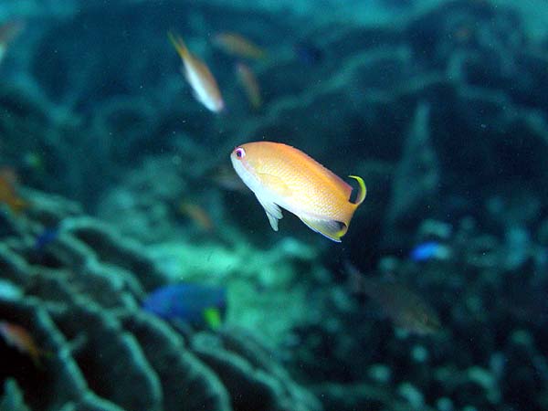 キンギョハナダイは、オレンジ色の体がとても華やかな小魚です。群れで泳ぐ姿はまるで花吹雪のようで癒されますね。