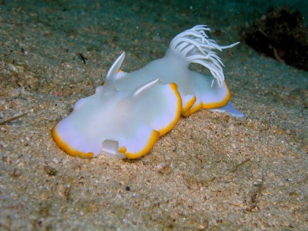 メレンゲウミウシは、白い体に黄色の縁取りがとても可愛いウミウシです。ゆっくり這う姿は癒されますね。