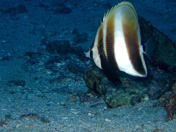 タキゲンロクダイ 末粕鼻 2025.05.27 [ 末粕鼻 ][ 中級 ] 体長 10〜15cm程度 水深 5〜30m程度 生息環境 サンゴ礁や岩礁の根周り 分類 スズキ目・チョウチョウウオ科 タキゲンロクダイは、黄色い体に黒い模様が美しい魚です。根周りをペアで泳ぐ姿はとても癒されますね。 食べ物 小さな無脊椎動物や藻類を食べます。 日頃の生活 ペアで根周りを泳ぎながら餌を探しています。 まめ知恵袋 黒い模様はとても目立って可愛いですよ。 撮影する時のコツ ワイド撮影でペアの姿をしっかり写すと可愛い写真になります。 [ 末粕鼻 ][ 中級 ]