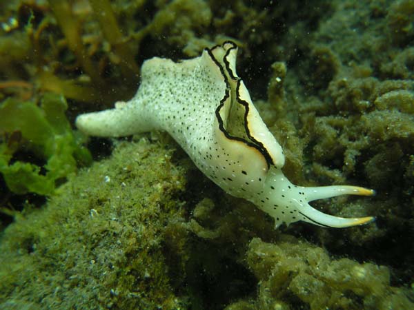 コノハミドリガイは、緑色の体に白い縁取りがとても可愛いウミウシです。ゆっくり這う姿はとても癒されますね。