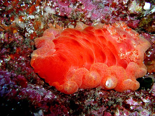 ミカドウミウシ 平瀬 2025.05.27 [ 平瀬 ][ 中級 ] 体長 10〜20cm程度 水深 5〜30m程度 生息環境 サンゴ礁や岩礁の根周りや壁面 分類 裸鰓類・フジタウミウシ科 ミカドウミウシは、赤紫色の体に白い斑点模様が美しい大きなウミウシです。ゆったり這う姿はとても神秘的ですね。 食べ物 付着藻類や微小な生物を食べます。 日頃の生活 壁面や根周りをのんびり移動しています。 まめ知恵袋 斑点模様はとても鮮やかで見応えがありますよ。 撮影する時のコツ マクロ撮影で模様をしっかり写すととても綺麗な写真になります。 [ 平瀬 ][ 中級 ]