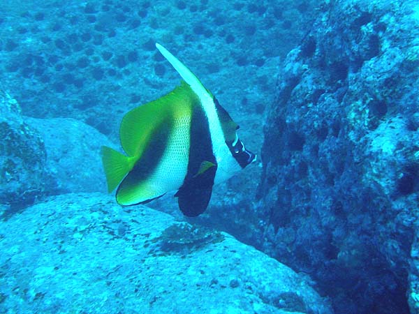 オニハタタテダイ 小島 2025.05.27 [ 小島 ][ 初級 ] 体長 10〜15cm程度 水深 5〜30m程度 生息環境 サンゴ礁や岩礁の根周り 分類 スズキ目・チョウチョウウオ科 オニハタタテダイは、長い背びれと白黒の体がとても目立つ可愛い魚です。ペアで泳ぐ姿はとても癒されますね。 食べ物 小さな無脊椎動物や藻類を食べます。 日頃の生活 ペアで仲良く泳いでいることが多いです。 まめ知恵袋 長い背びれはとても目立って可愛いですよ。 撮影する時のコツ ワイド撮影でペアの姿を活かすと可愛い写真になります。 [ 小島 ][ 初級 ]